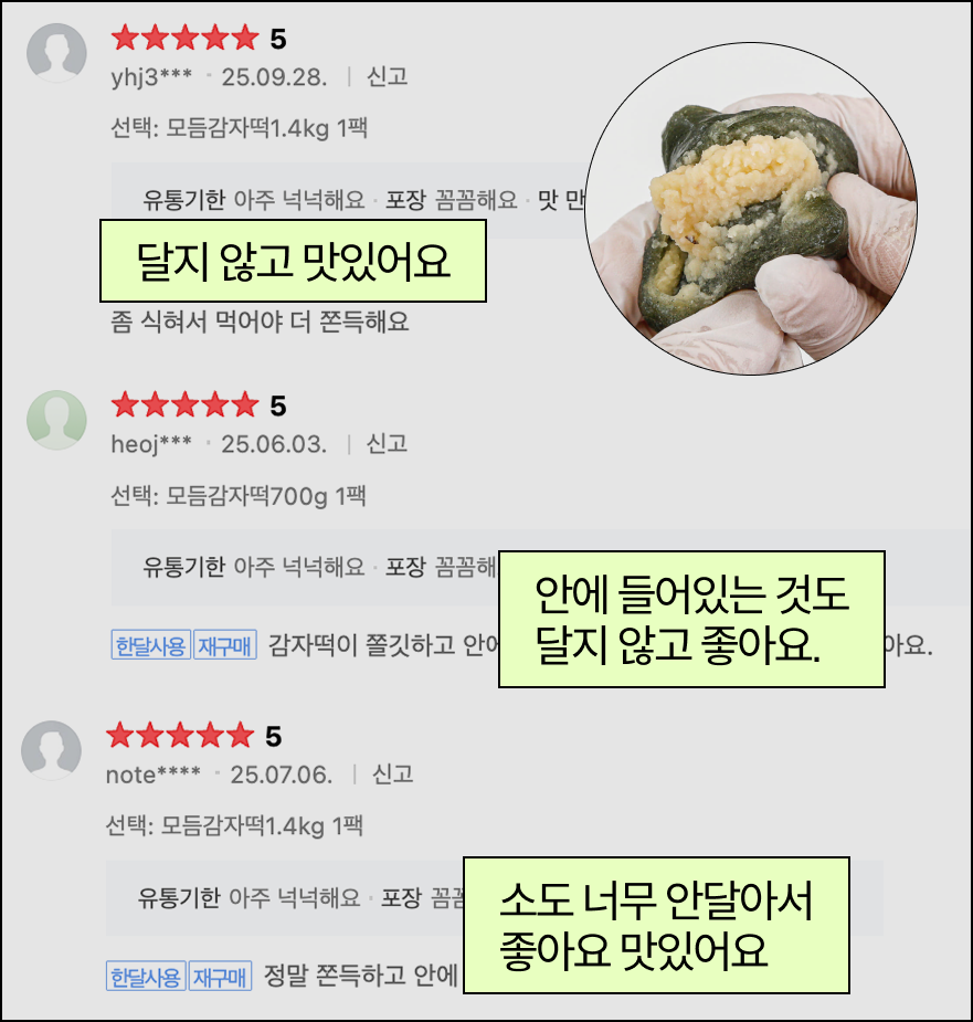결국 음식의 본질은 맛이잖아요. ‘내 입맛에 맛없으면 안 된다’라는 기준으로 감자떡을 여러 방향에서 계속 다듬어왔어요. 모양도 조금 더 동그랗고 매끈하게 바꾸고, 떡 안에 들어가는 소도 더 푸짐하게 넣었습니다. 그러다 보니 저희 감자떡을 유독 좋아해 주시는 고객분들이 하나둘 생기기 시작했죠.