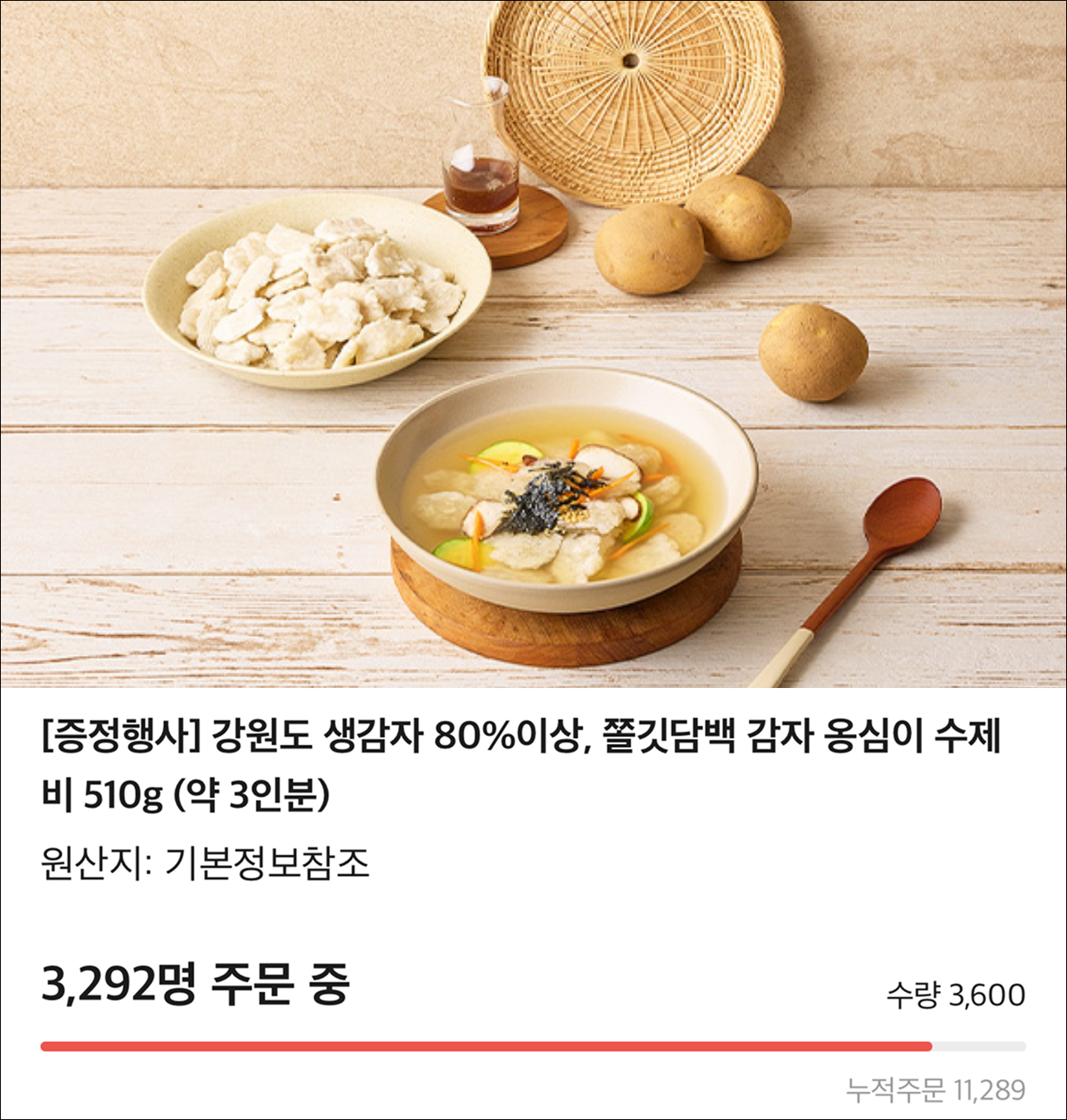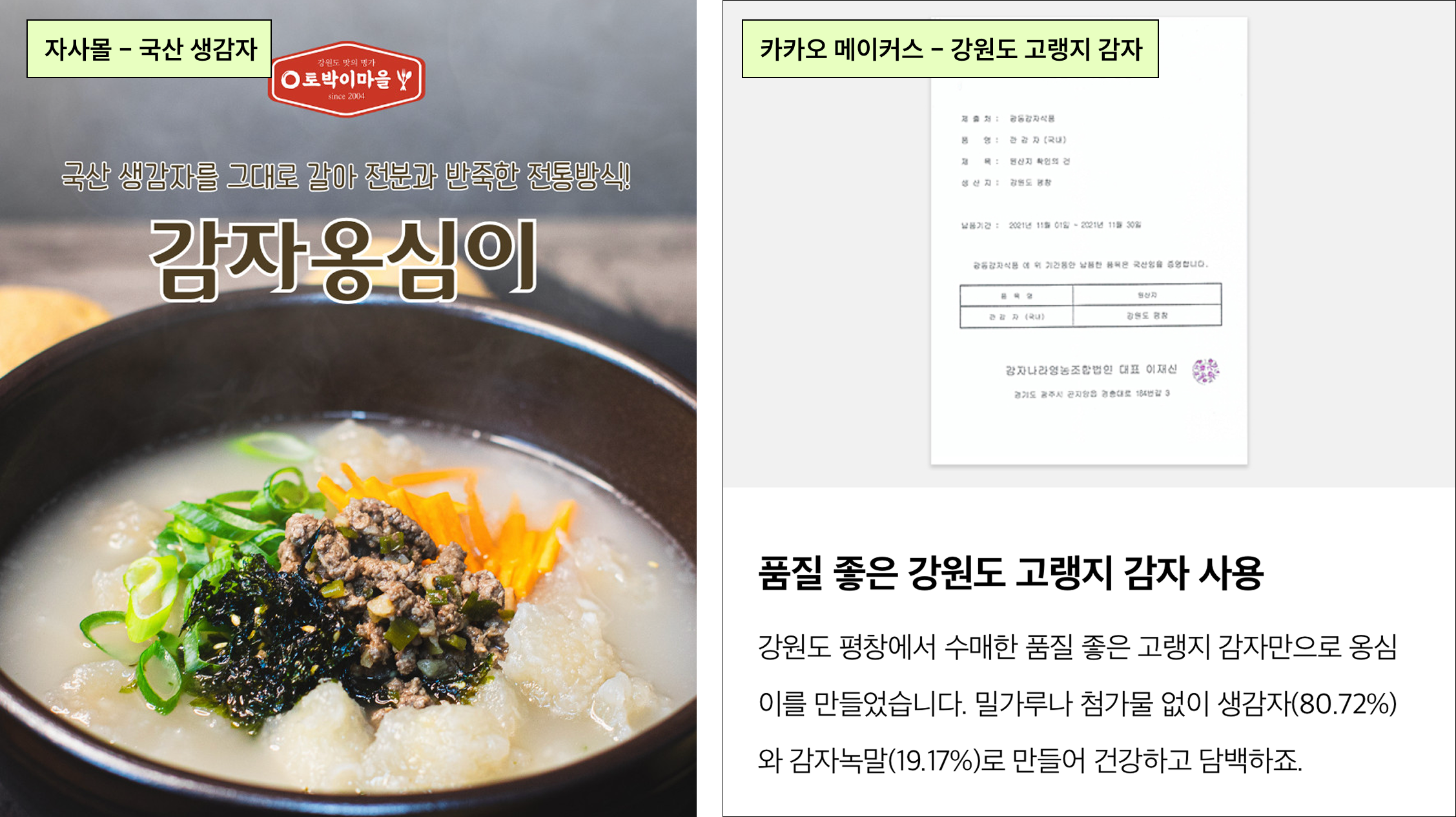 또 하나 중요한 점은, 제품에 명확한 판매 소구점이 반드시 있어야 한다는 점인데요. 소구점이 분명하지 않다면, 전략적으로 만들어 내기라도 해야 합니다. 그래서 저희는 같은 옹심이 제품이라도 카카오 메이커스 전용으로 '강원도 감자'만을 사용해 별도로 제작합니다. 메이커스에서는 ‘강원도 감자만을 사용했다’는 점을 전면에 내세워 차별화하고, 그 메시지를 더욱 선명하게 전달하는 거죠. 당연히 토박이마을을 처음 접하는 고객들에게도 제품의 매력이 훨씬 직관적으로 느껴질 수밖에 없겠죠. |