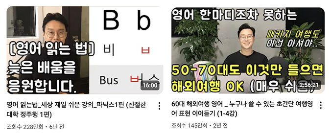 친절한 영어교실은 121만 명의 구독자 중 80%가 50대 이상인 유튜브 채널 ‘ 친절한 대학’을 기반으로 창업했는데요. 연령별로 잘 맞는 영어 학습법은 다르다는 메시지를 강조하며, 입시나 취업 대비가 아닌 해외여행이나 일상 대화처럼 실생활에 꼭 필요한 영어를 중심으로 커리큘럼을 구성했습니다. “곧 딸 보러 미국에 가야 하는 부모님”, “패키지여행에서 영어가 안 돼 무시당할까 걱정인 여행객”처럼 시니어가 마주할 구체적인 상황을 짚어내며 메시지에 설득력을 더했죠.