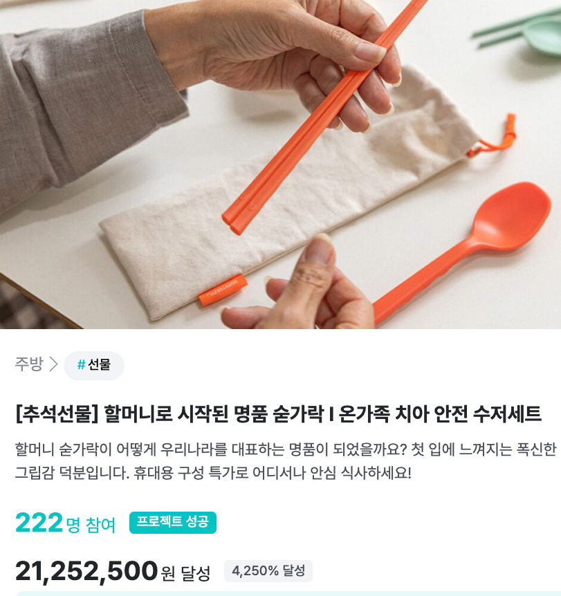 이러한 세심한 배려와 일관된 진심은 고객들의 강력한 신뢰로 이어졌습니다. 그 결과, 첫 와디즈 펀딩에서 2,000만 원 이상의 펀딩액을 달성하는 성과를 거두며, 차근차근 성장하고 있습니다. |