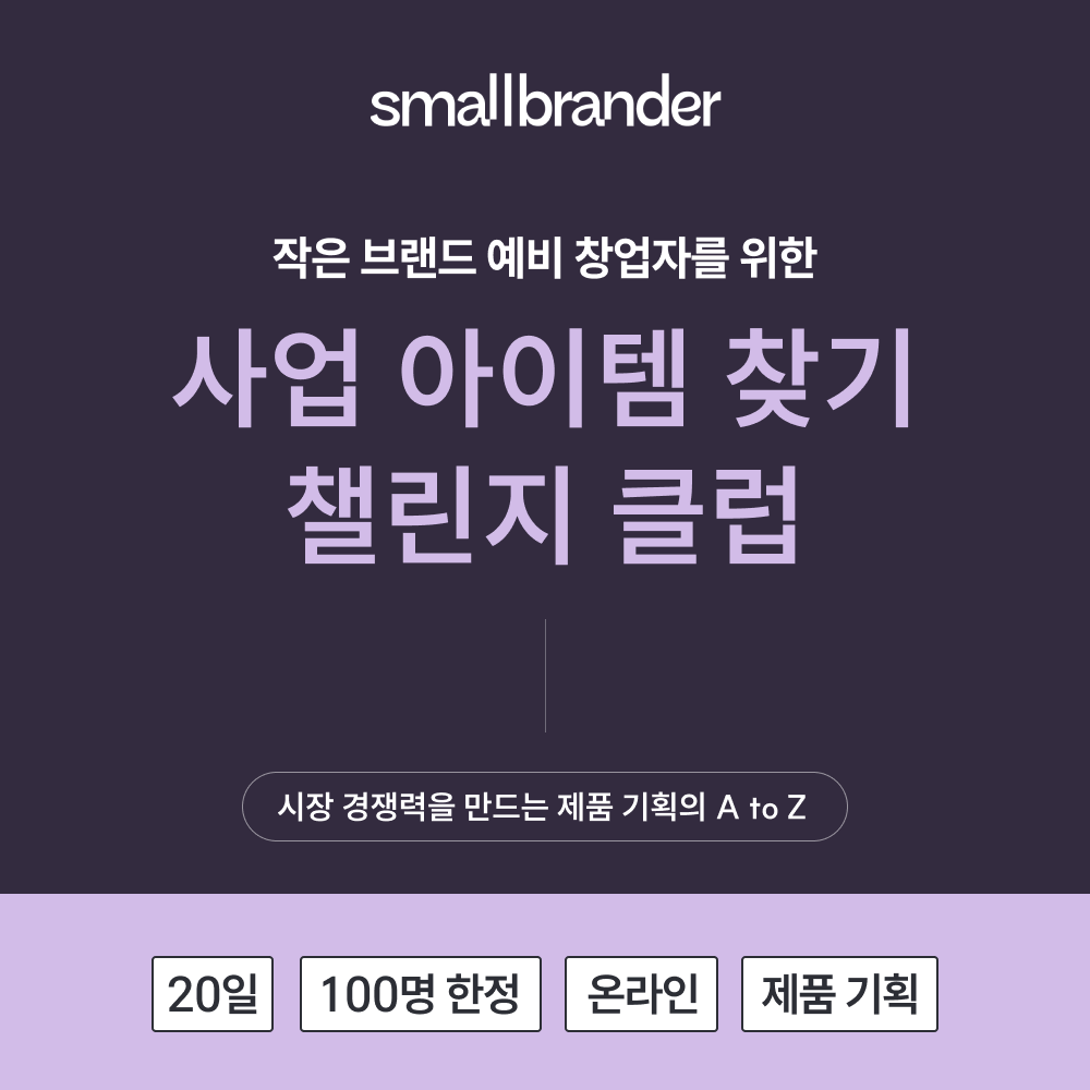 스몰브랜더의 〈사업 아이템 찾기 클럽 3기〉에서 직접 경험해보세요. 시장성과 지속 가능성을 동시에 잡을 수 있는, 한끗 다른 나만의 제품 아이디어를 기획해갈 수 있습니다.