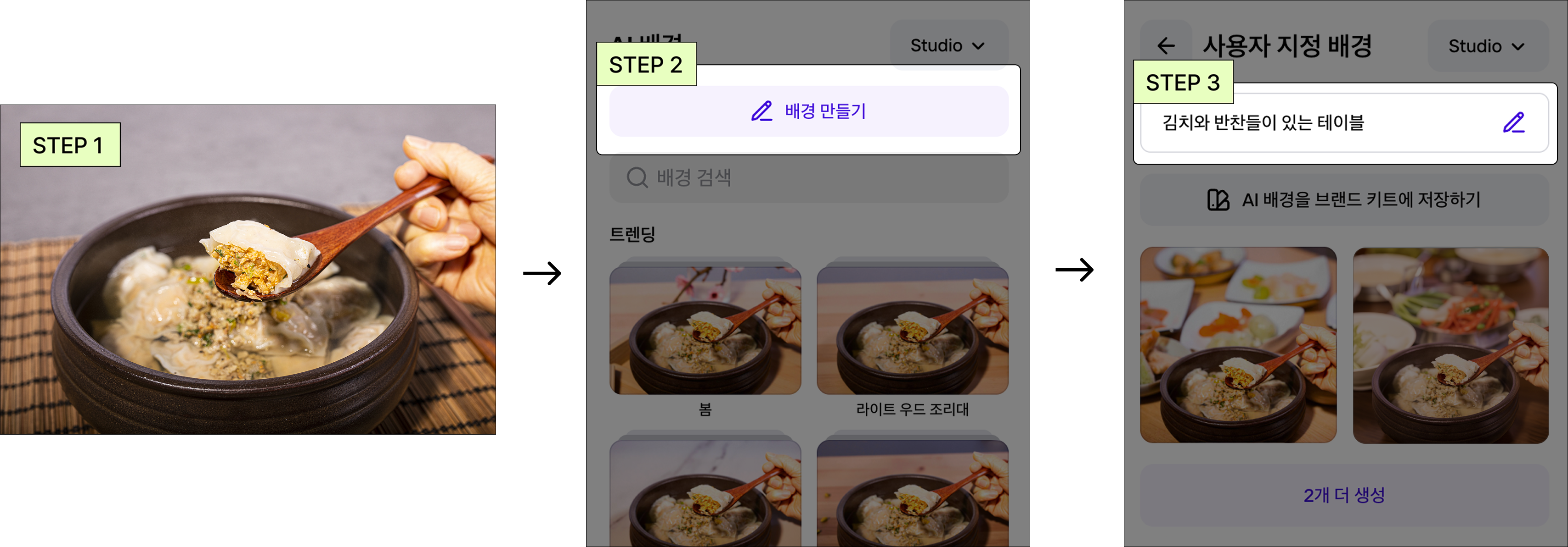 포토룸 사용은 생각보다 너무 간단해서, 누구나 쉽게 따라할 수 있어요. ➊ 휴대폰으로 제품 사진을 찍어서, ➋ 포토룸에 업로드 후 '배경만들기'를 누르면, 어울리는 배경을 생성해 다양한 연출컷을 얻을 수 있고요. ➌ 여기에, "반찬을 추가해줘"와 같이 간단한 명령어까지 입력하면, 더욱 정교한 결과물을 얻을 수 있습니다. |