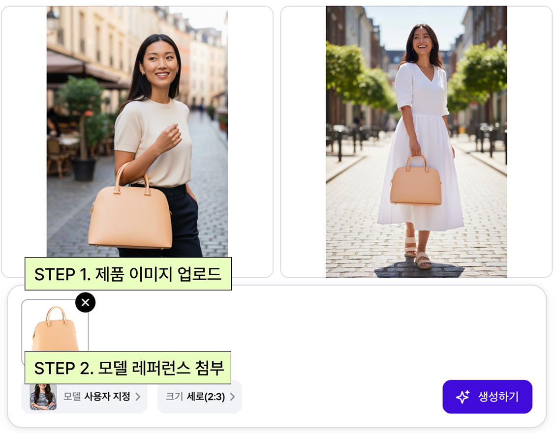 AI로 가상 모델을 활용하는 것이 어렵지 않냐고요? 앞서 소개한 ‘ 포토룸’을 활용하면 쉽게 할 수 있어요. ➊ 제품 사진을 촬영하고, ➋ 원하는 모델의 이미지를 함께 첨부하면, 가상의 모델이 제품을 자연스럽게 들고 있는 이미지를 생성해줍니다.
