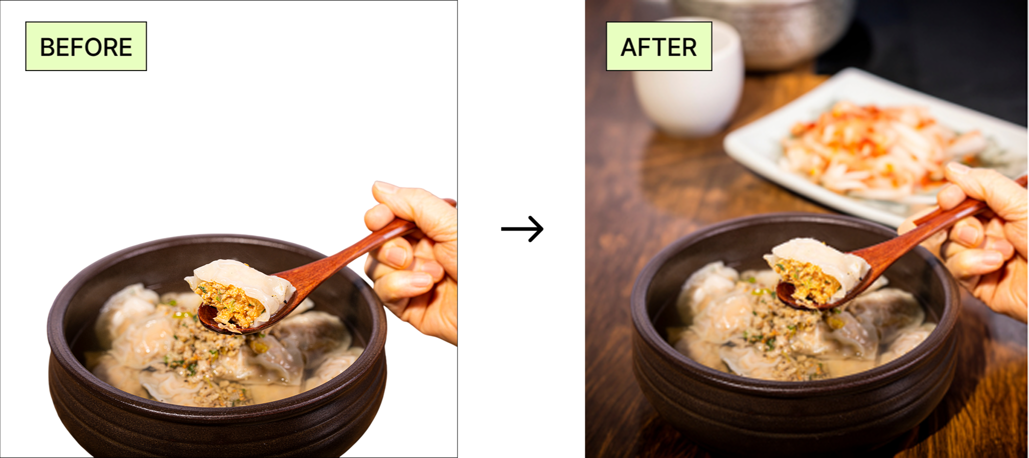 2024년 기준 약 35억 원의 매출을 달성한 강원도 원주의 만두 브랜드 ‘토박이마을’은 아마추어도 쉽게 사용하는 AI 사진 편집기 '포토룸'을 활용해 휴대폰 사진으로 상세페이지에 쓰이는 다양한 제품 연출컷을 제작하는데요. 덕분에 토박이마을의 만두가 다양하게 요리되는 상황을 손쉽게 보여줄 수 있죠.