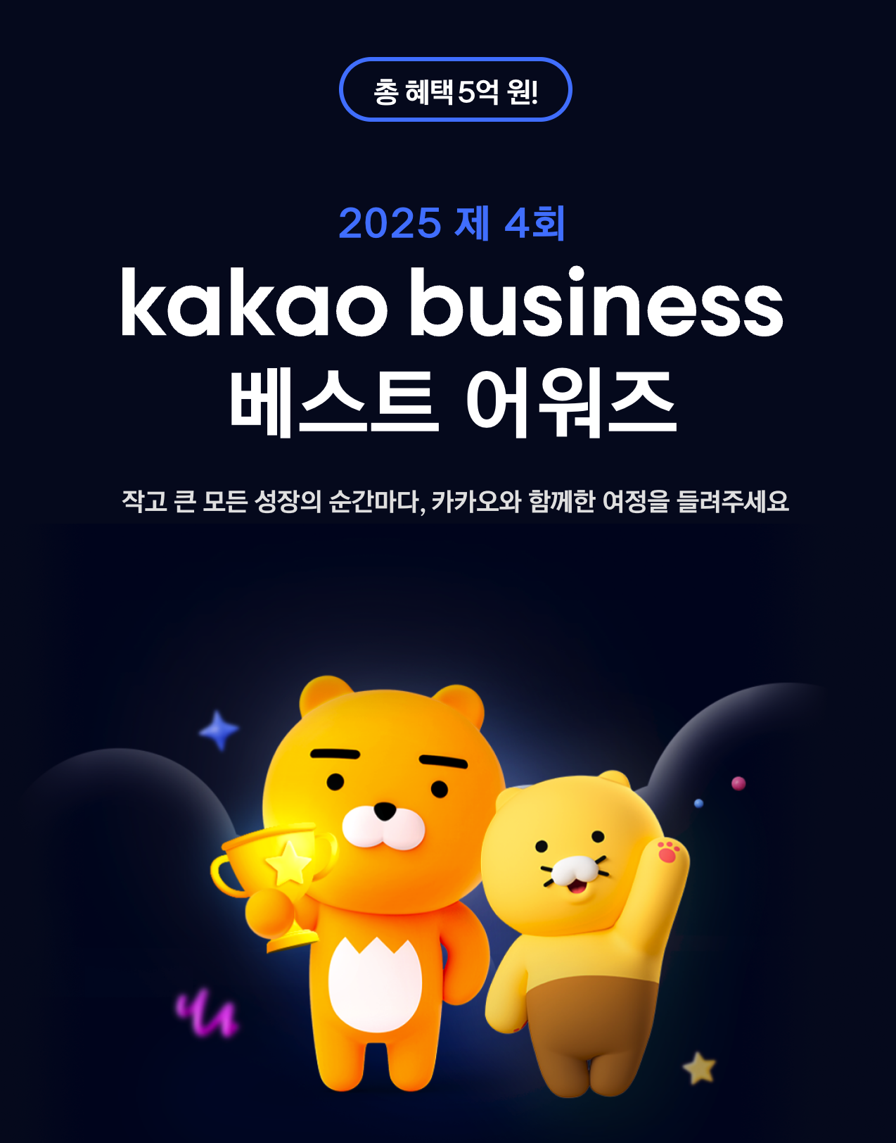 🔅 카카오 비즈니스 베스트 어워즈 🔅 ✅ 지원 기간: 10월 1일 ~ 11월 3일 (자정 마감) ✅ 수상팀 발표: 11월 21일 (총 120팀) ✅ 시상식: 12월 10일 (용인시 카카오 AI 캠퍼스 예정)